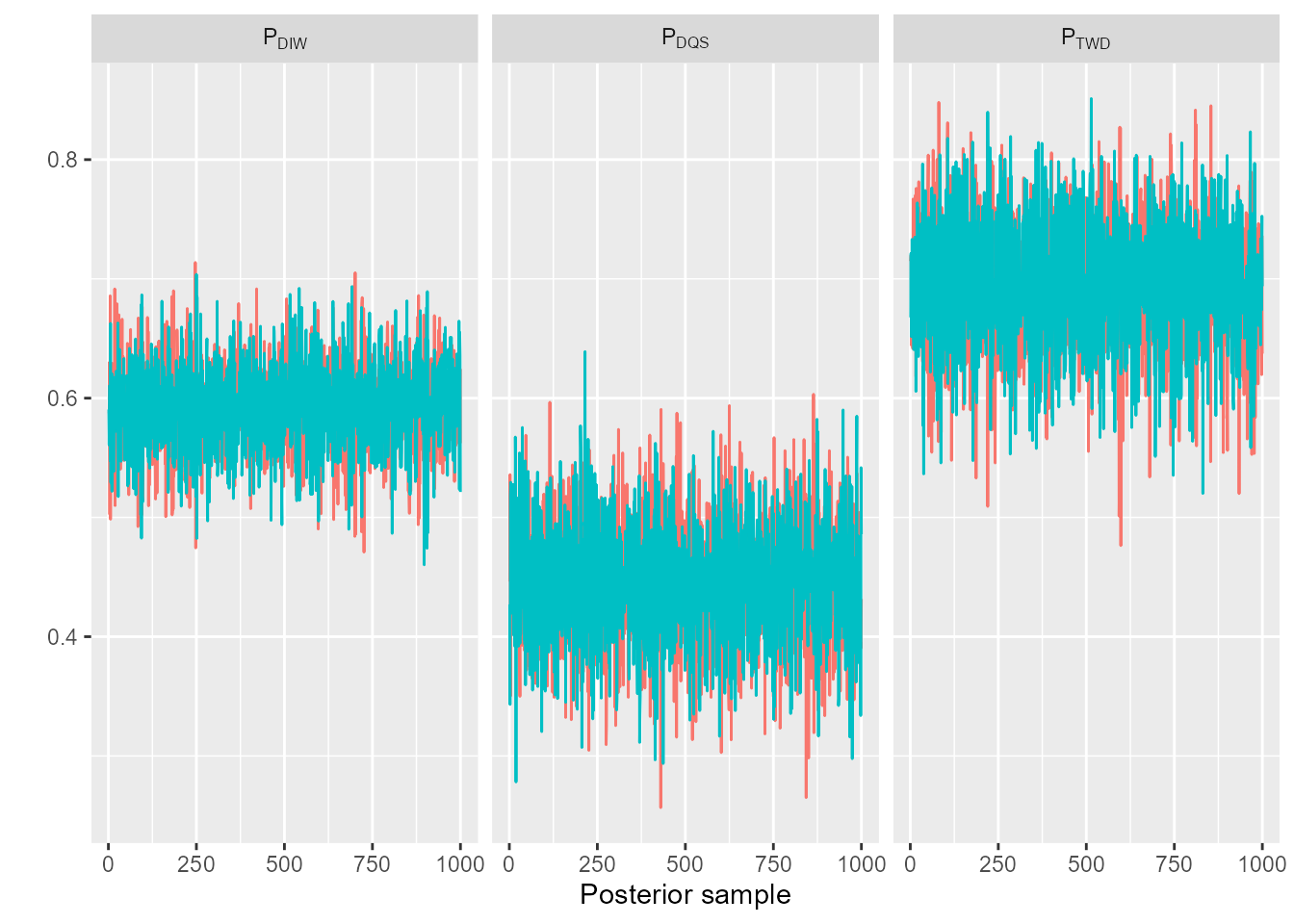 Trace plots can be used to visualise convergence. For example, we can plot trace diagnostics for the biological parameters using, for example: