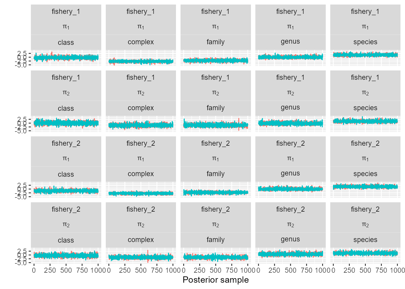 trace_plot(sefra_mdl, pars = c("p_obs_logit"), labels = list(fishery_group = sefra_dat$fishery_groups, pi = paste("pi[", 1:sefra_dat$n_pi, "]"), resolution = as.character(unique(sefra_dat$resolutions))))